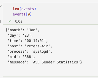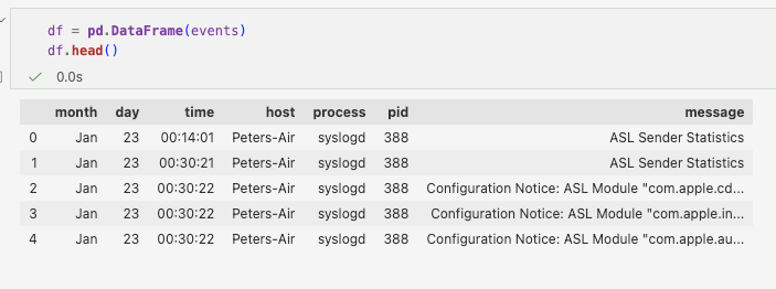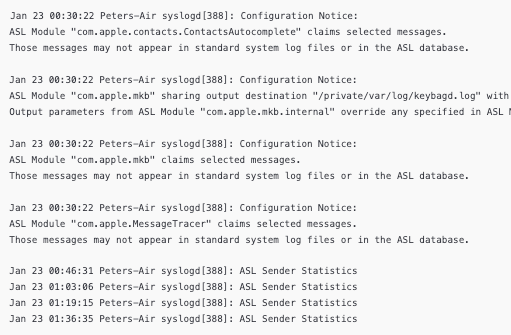These logs can be found at /var/log/system.log. macOS system logs are ephemeral; in practice, pipelines must persist and aggregate logs over time for analytics.