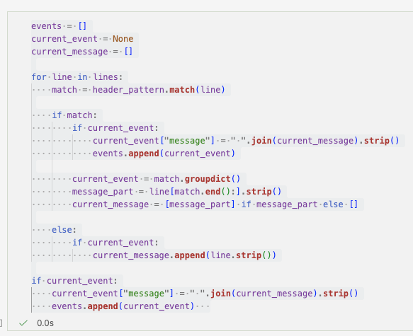 When a line matches the header pattern, it marks the start of a new event. If not, it is appended to the previous event. This ensures multi-line messages remain intact.