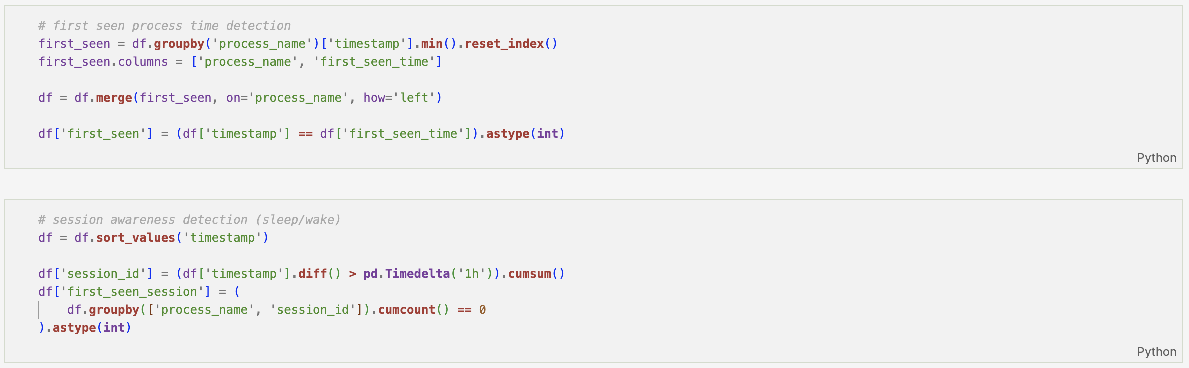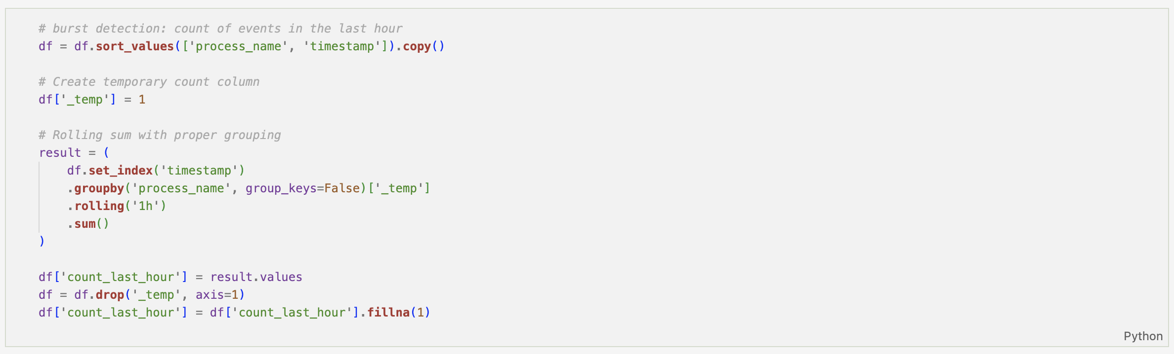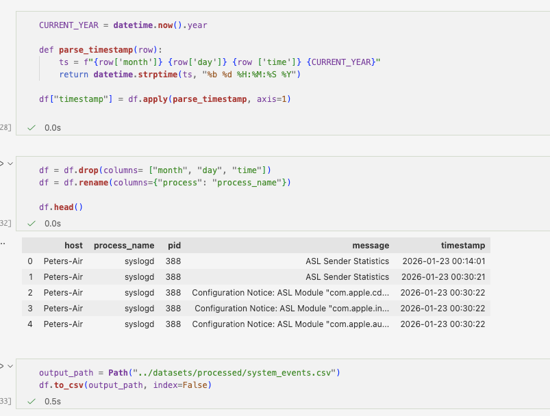 By the end of this notebook, structured macOS system logs have been transformed into a detection-ready dataset containing temporal, statistical, and session-aware features.