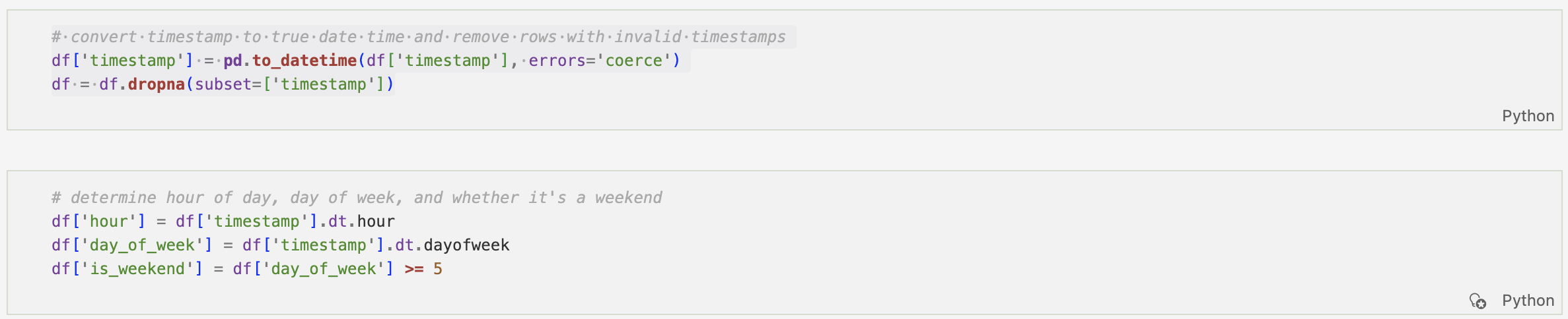Time-based context is introduced first. Timestamps are converted into true datetime objects, enabling extraction of hour-of-day and day-of-week features.