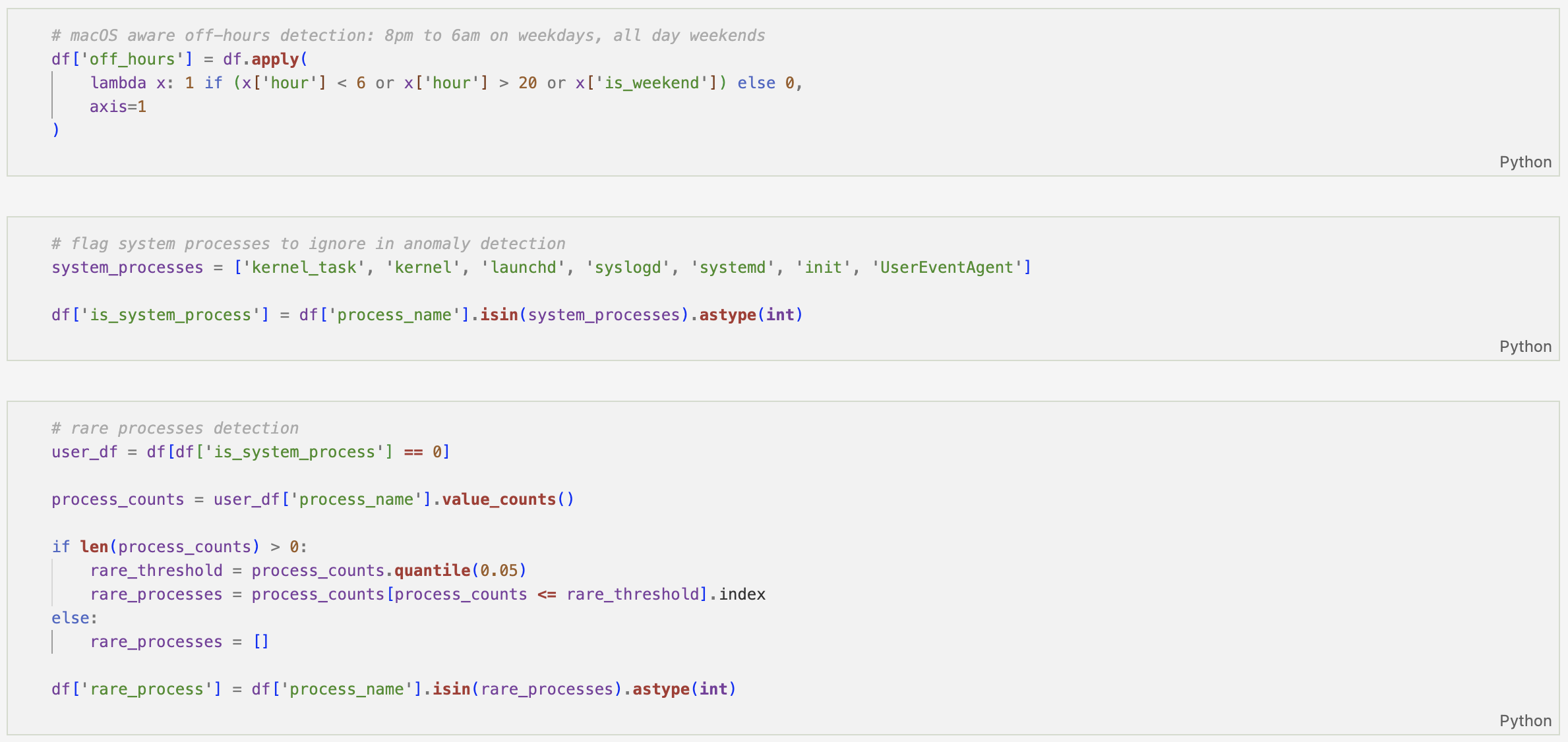 System-level noise is then filtered by flagging common macOS background processes. This ensures later anomaly detection focuses on meaningful user-driven behaviour rather than expected operating system activity.